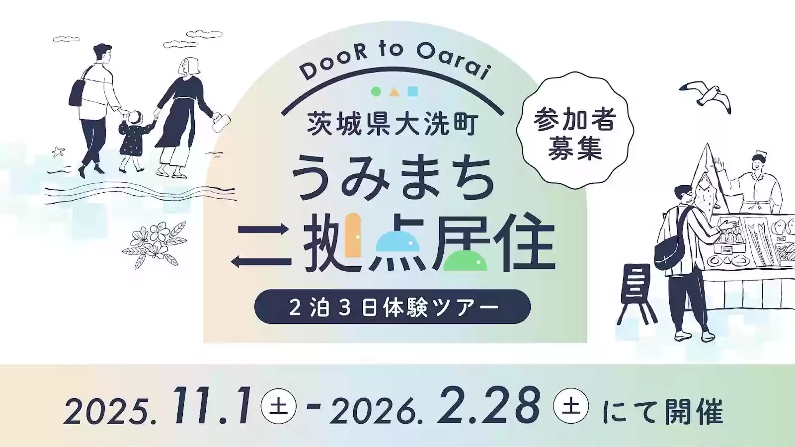 「平日は都会、週末は海。」——そんな 二拠点居住 を現実味ある形で試せるのが、茨城県大洗町の うみまち二拠点居住体験ツアー です。2025年11月〜2026年2月のあいだ、計 4組 を対象に、2泊3日のカスタマイズ型プログラムを実施。リモートワーク、家族時間、地域交流、自然体験など、あなたの関心に合わせて行程を設計し、「大洗でのもう一つの暮らし」を等身大で体感します。