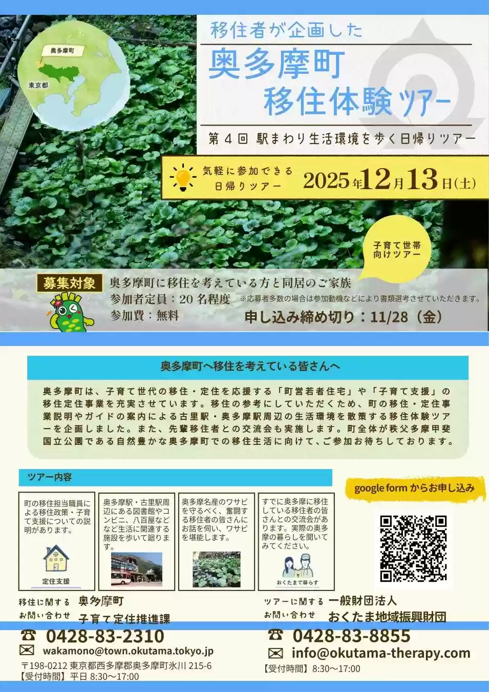 ツアー詳細・申込(奥多摩町公式) https://www.town.okutama.tokyo.jp/kosodate/ijuteijujoho/okutamadekurasu/3577.html