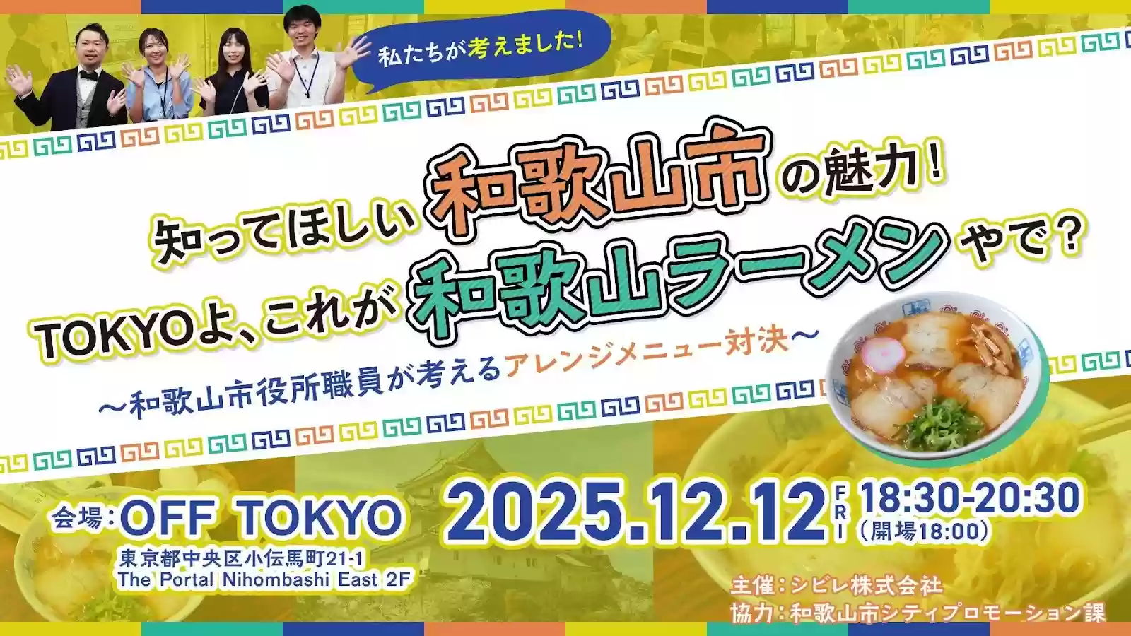 和歌山市シティプロモーション課とシビレ株式会社は、首都圏のみなさんに“いまの和歌山市”を体感していただく企画として、12月12日(金)18:30〜20:30に「知ってほしい和歌山市の魅力!TOKYO よ、これが和歌山ラーメンやで?」を開催します。会場は東京・小伝馬町の「OFF TOKYO」。人気店「井出商店」をベースにした和歌山ラーメンのアレンジメニュー試食・投票、市職員&地域おこし協力隊によるトーク、交流タイムまで、参加費1,000円で楽しめる“味と暮らし”のクロスオーバーイベントです。
