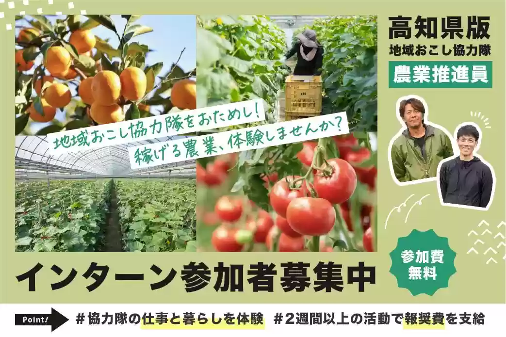 「農業の現場で腕を磨き、将来は法人経営にも挑戦したい」。そんな思いを、高知で一歩進めませんか。 高知県版・地域おこし協力隊「農業推進員」インターンは、県内の農業法人で 2週間~4週間 活動しながら、仕事と暮らしの相性をじっくり確かめられる制度。参加費は無料、終了後には 日額12,000円の報償費が支給されます。