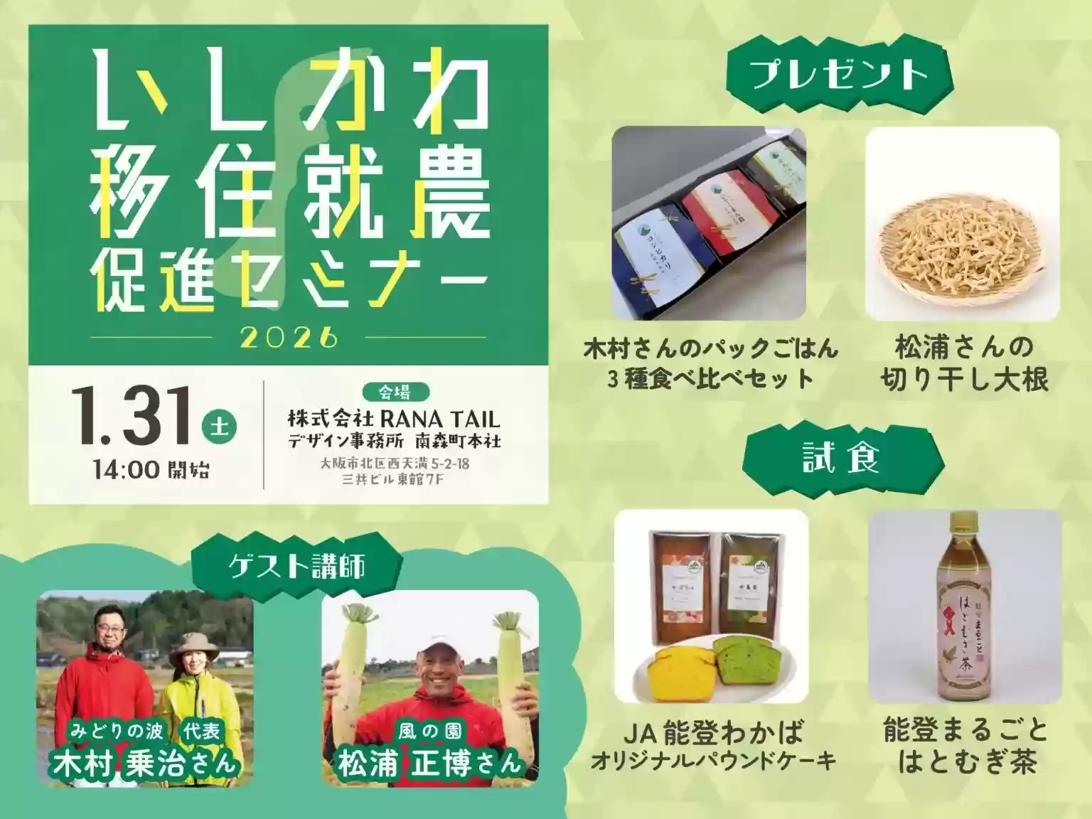 大阪開催の「いしかわ移住就農促進セミナー」は、体験談・交流・相談が一度にできる貴重な機会。 石川県への移住や新規就農を考えている方は、この機会をうまく使って、未来の選択肢を広げてみてください。