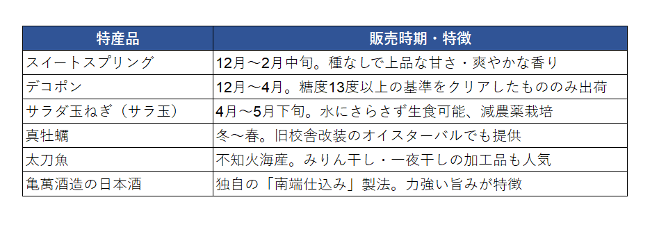食の面では、不知火海の恵みを受けた真牡蠣(冬〜春)、糖度13度以上を誇るデコポン、種なしで香り高いスイートスプリング、水にさらさず生食できるサラダ玉ねぎ、脂乗りのよい太刀魚など、季節ごとの特産品が揃います。